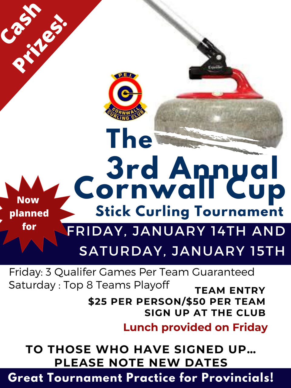 The third annual Cornwall Cup Stick Curling event at the Cornwall Curling Club has been postponed one week due to current Public Health Office restrictions and is now scheduled for January 14th and 15th. See poster for event details.
