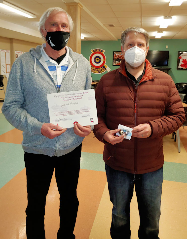 David Murphy (left), Asham Coaching award winner for junior women’s teams, with Curl PEI VP Ryan Giddens