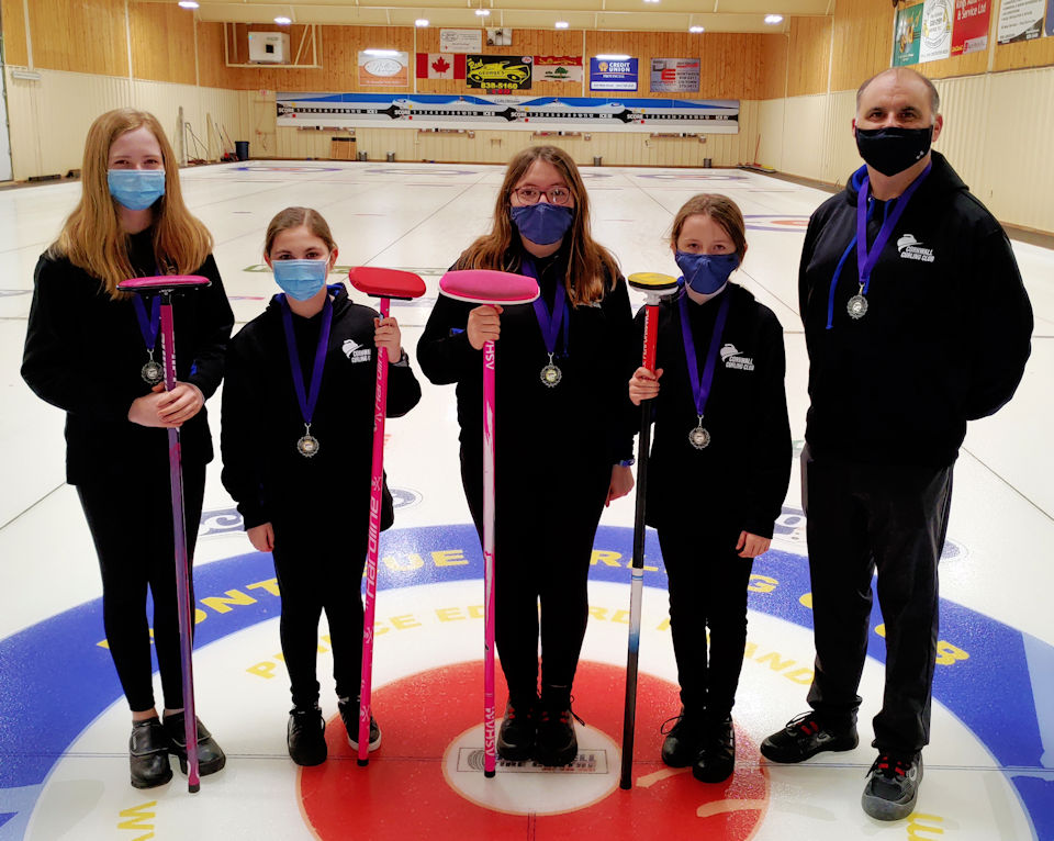 Myers Finalist rink (L-R): Grace Myers (skip), Greta Edgett-Gallant (3rd), Norah MacKinnon (2nd), Lily Whalley (lead), coach Darren Gallant.