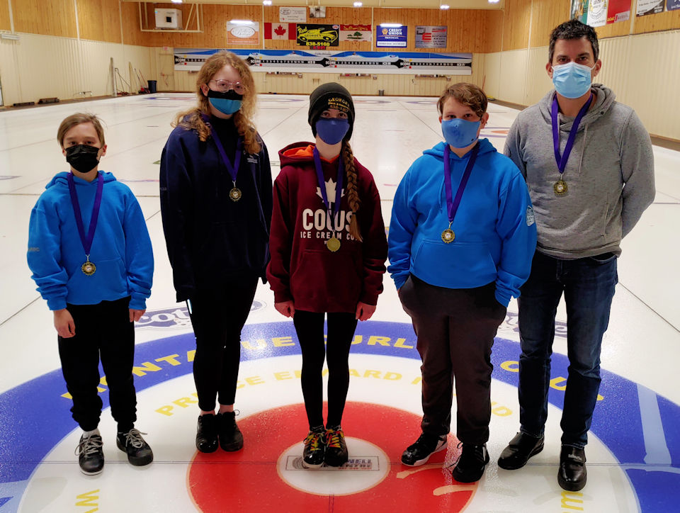 Winning Savill team (L/-R): Aiden Savill (skip), Veronica Pater (3rd), Sophie Gallant (2nd), Oliver MacEwen (lead), coach Craig Savill