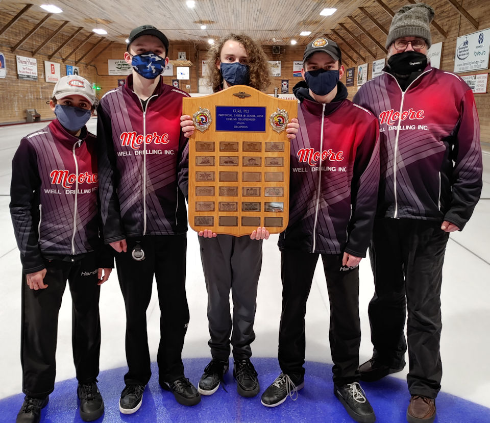 U18 Boys Champions — Team Dalton (L-R): Isaiah Dalton (skip), Connor Bruce (3rd), Sheamus Herlihy (2nd), Nate MacRae (lead), A.J. Campbell (coach)