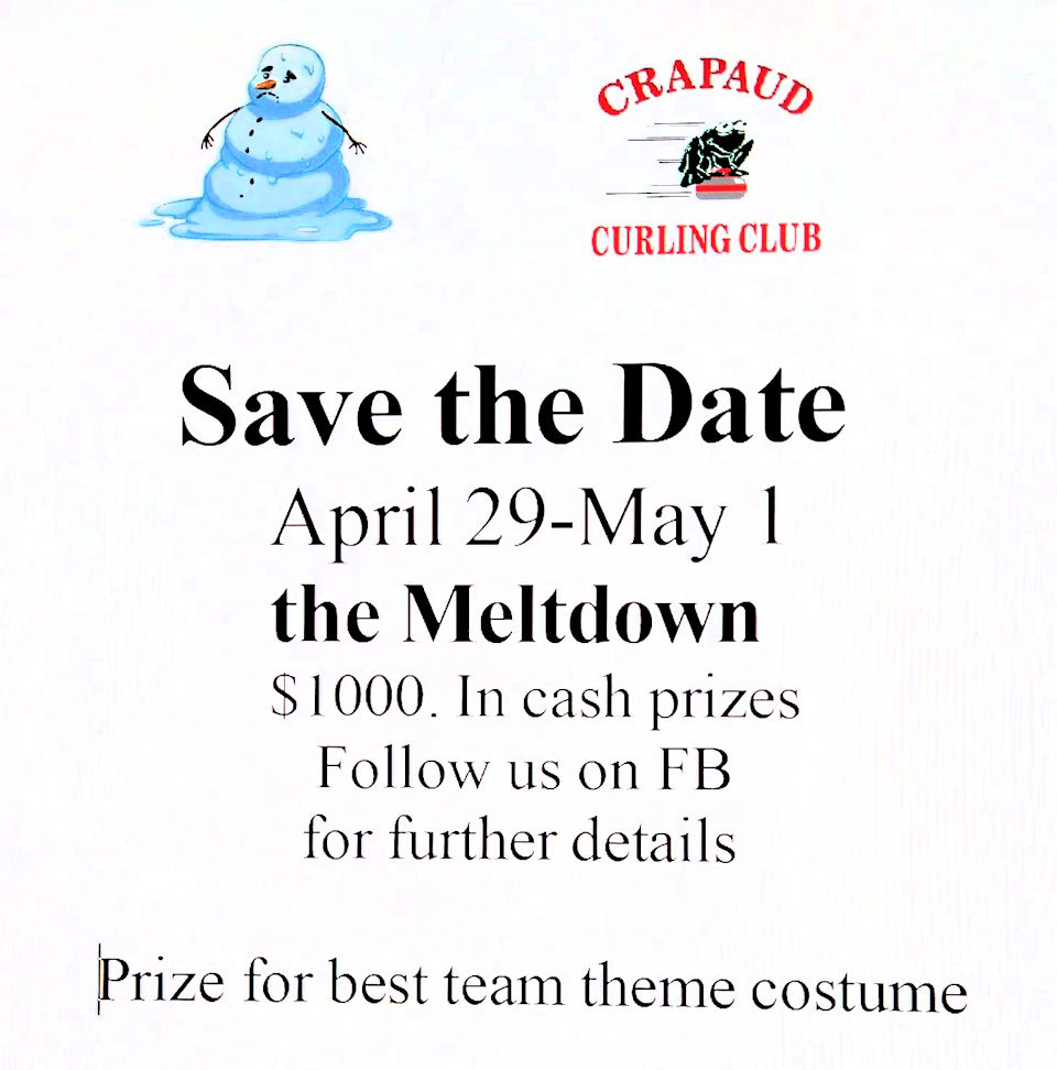 Annual Meltdown spiel at Crapaud starts Apr. 29 Posted on March 17, 2022 by adminMarch 17, 2022Save the dates (April 29-May 1) and watch the Crapaud Curling Club Facebook page for further details about the annual Meltdown bonspiel. $1000 in cash prizes, prizes for best team theme costume.Share this: Share on Facebook (Opens in new window) Facebook Email a link to a friend (Opens in new window) Email Share on X (Opens in new window) X Related