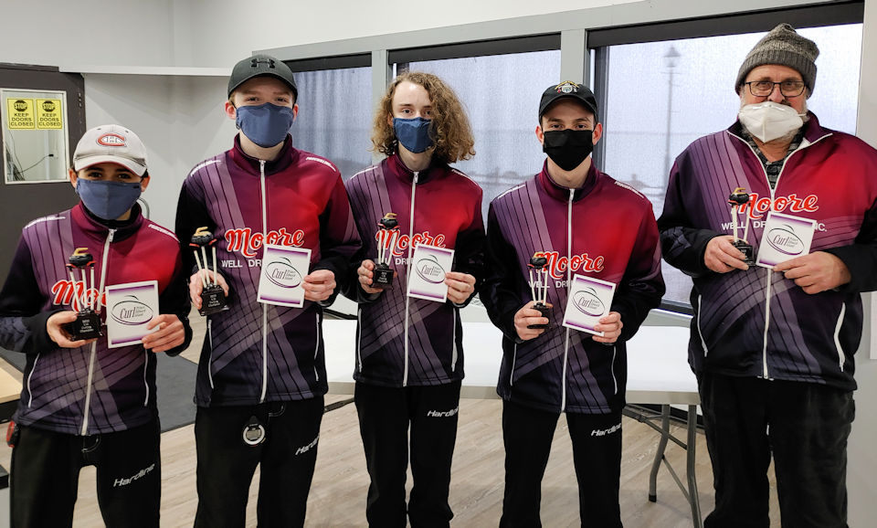 PEI U16 Champions, Team Dalton (L-R):  Isaiah Dalton (skip), Connor Bruce (3rd), Sheamus Herlihy (2nd), Nate MacRae (lead), A.J. Campbell (coach), from the Cornwall Curling Club