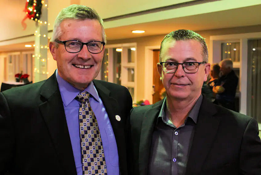 Curlers and former teammates Peter Gallant, left, and Robert Campbell catch up with each other after their induction ceremony into the P.E.I. Sports Hall of Fame in Charlottetown Nov. 25. Grant Harrison • Special to The Guardian – Contributed