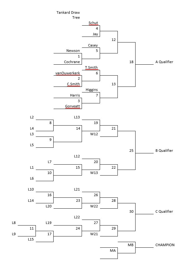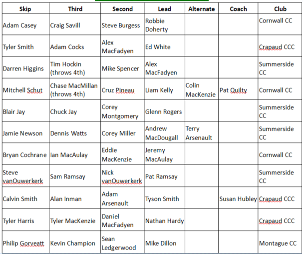 The eleven teams entered will be playing a modified triple knockout. The Adam Casey and Tyler Smith teams have been seeded 1st and 2nd based on their Canadian Team Ranking System (CTRS) points. Draws go daily at 9 am, 2 and 7 pm from the 25th – 28th, with the Championship Round (not needed if a team wins all three draw sections) going Sunday the 29th at 9 am and, if needed, 2 pm.