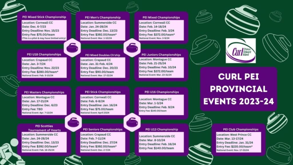 2023-24 Curl PEI Provincial Events Calendar Released Posted on July 6, 2023 by ExecDirJuly 6, 2023Here are the approved dates and location for Curl PEI Provincial Curling Championships and Events for the 2023-24 season. Please note start and end dates may vary slightly depending on signup numbers.Registration sites will open in September. Share this: Share on Facebook (Opens in new window) Facebook Email a link to a friend (Opens in new window) Email Share on X (Opens in new window) X Related