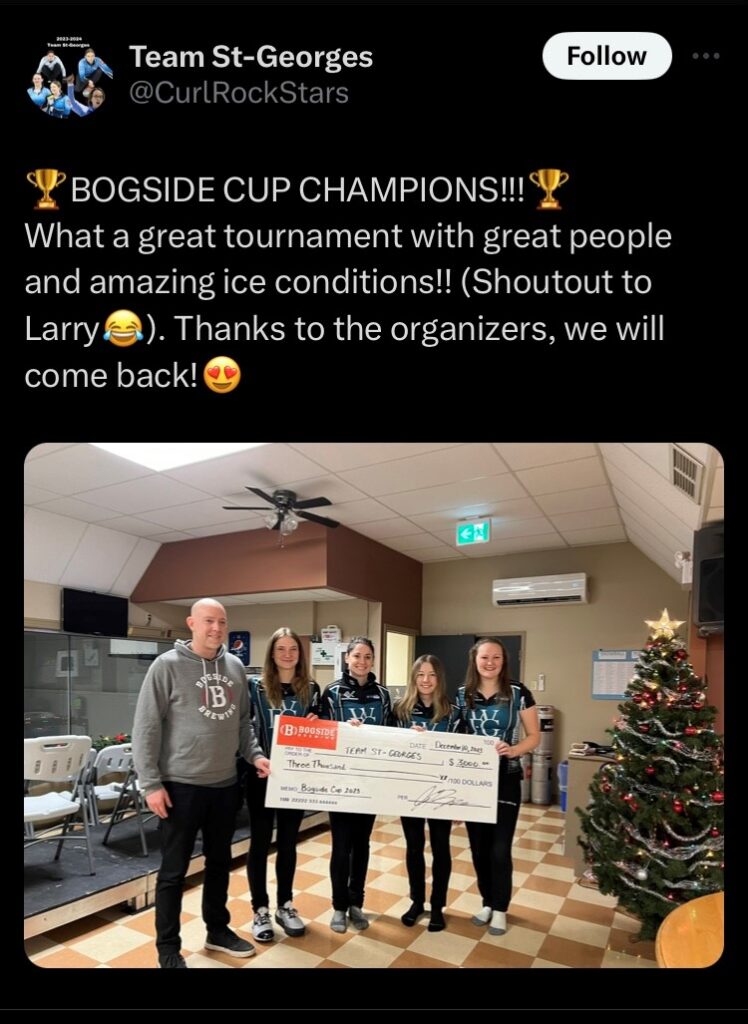 A consistent topic of conversation around the Montague Curling Club from all 16 teams was how incredible the ice conditions were. In her victory speech, St-Georges stood up and said “This is the best club ice any of us have played on. These kinds of ice conditions are what you want leading up to the Scotties because it is very similar.” Huge thank you’s go out to Larry Richards and his Ice crew for their top notch conditions, Thomas Annear and everyone at the Montague Curling Club who helped out and accommodated the curlers, Ryan Giddens for Coordinating the spiel, and Bogside Brewing.