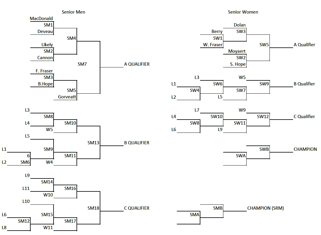 Teams in both divisions are playing modified triple knockout draws, where the winning team from each section also gets to compete in the next section. If a team wins all three sections, they will win the event without a championship round. If a team wins two sections, they will advance to a championship game against the winner of the other section and will take the championship if they win the game. If the other team wins, there will be a second championship game, with the winner of that game going to the nationals. If there are three separate section winners, the team that played in the most section finals will earn a bye to the second championship game where they will face the winner of a game between the other two finalists.