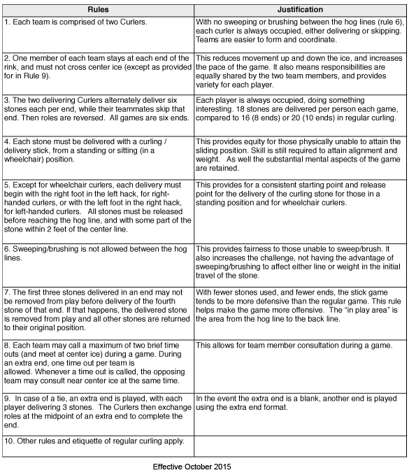 In stick curling there are two curlers per team, who deliver their rocks with delivery sticks, with each team member delivering from opposite ends. Sweeping is allowed only from the hog line to the back of the house at the playing end. Two curlers, one from each team, alternately deliver 6 stones each per end, while their teammate skips that end. The roles are then reversed, and the partners deliver the stones back. No stone may be removed from play until the fourth stone of each end. Games are six ends and take about an hour to play. For more information on stick curling, visit www.canadianstickcurling.ca.