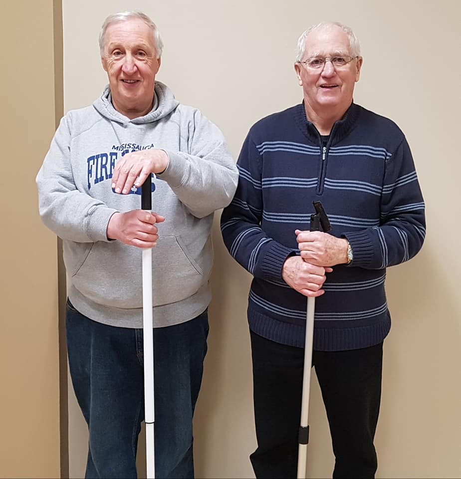 PEI Stick Open Division winners Roddie MacLean (left) and Paul Field (right) with provincial stick curling co-ordinator Ernie Stavert