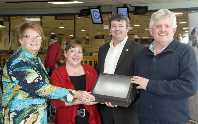 Shown holding a new LED security light to be used in the energy retrofit of the Silver Fox Curling and Yacht Club are (l-r) Marlene Boiley, executive director of the club; Community Services, Seniors and Labour Minister Janice Sherry; Fisheries, Aquaculture and Rural Development Minister Neil LeClair and Brent Drummond, club chair.