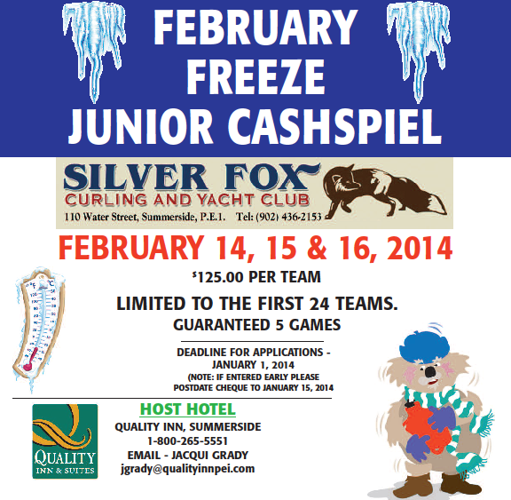 The Silver Fox Curling & Yacht Club is hosting its annual February Freeze Junior Cashspiel, February 14, 15, and 16 2014. Deadline for applications is January 1.