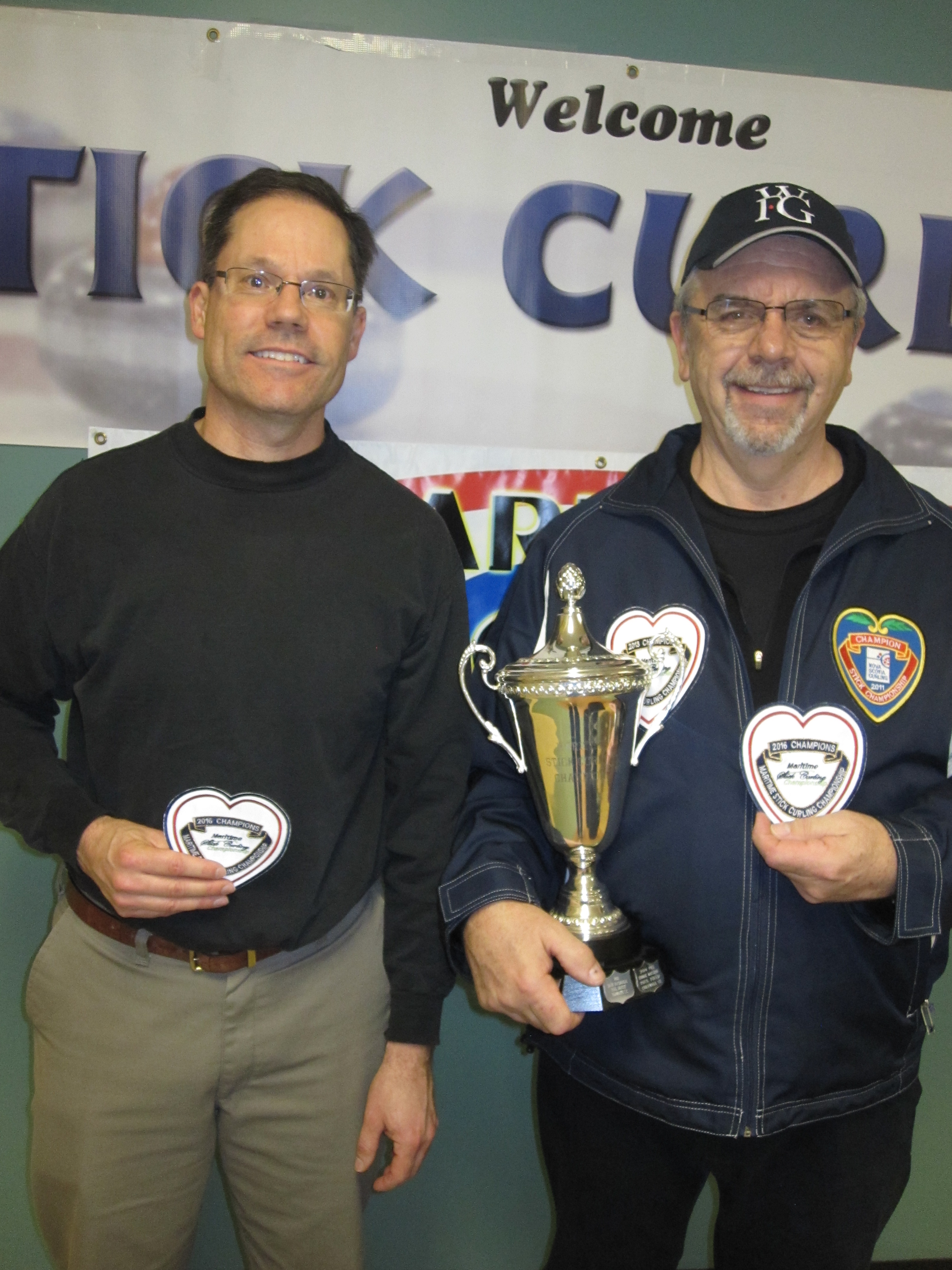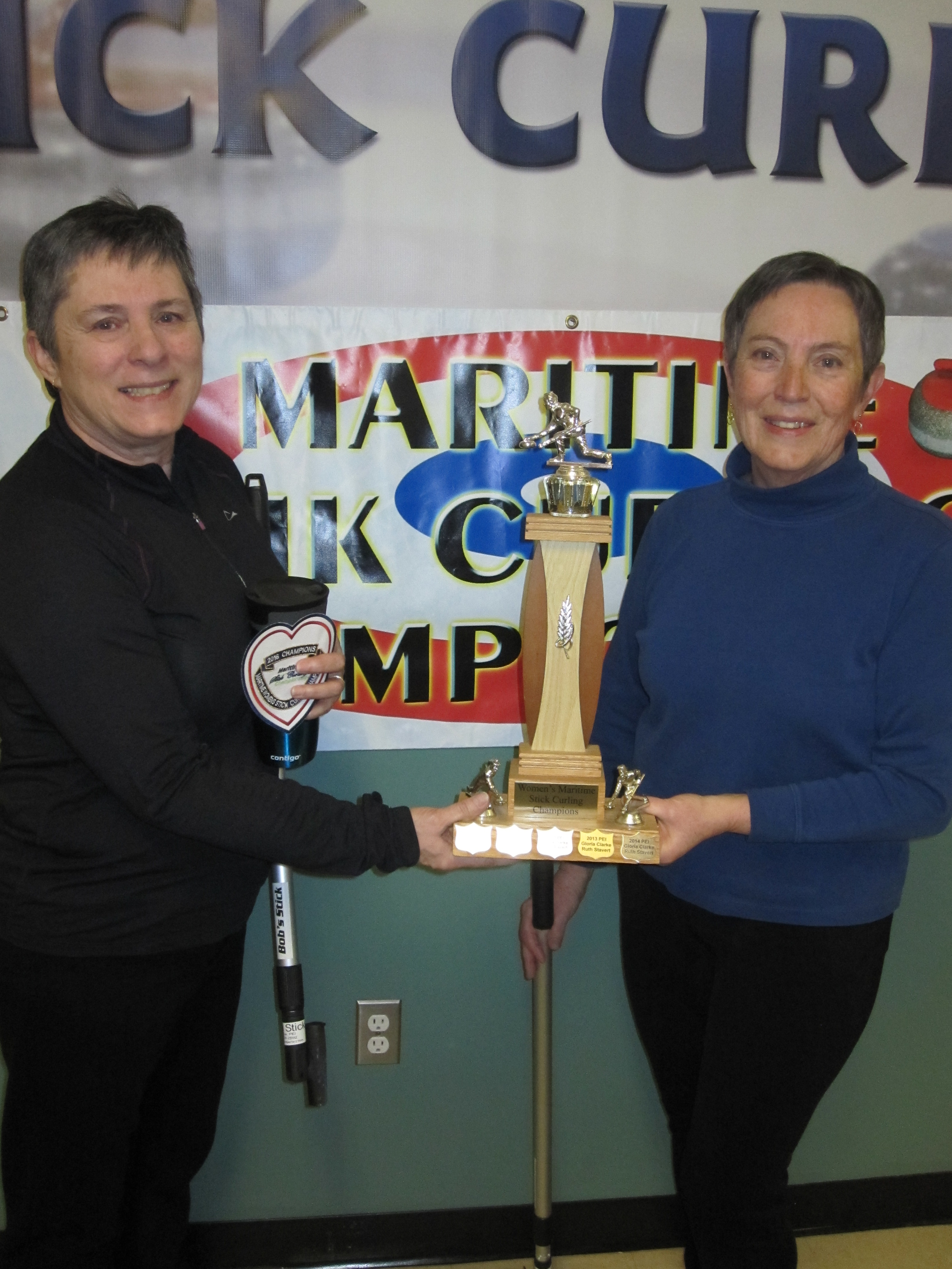 The Dave MacDougal/Paul Doucet team from Yarmouth NS won the open division of the Maritime Stick Curling Championship held recently at the Cornwall Curling club by narrowly defeating the Ron Crowe/Bill Spinney team from Truro. The women’s division championship game was an all Cornwall PEI event with the Etta Reid/Myrna Craswell team defeating the 5 time champion team of Ruth Stavert and Gloria Clarke.