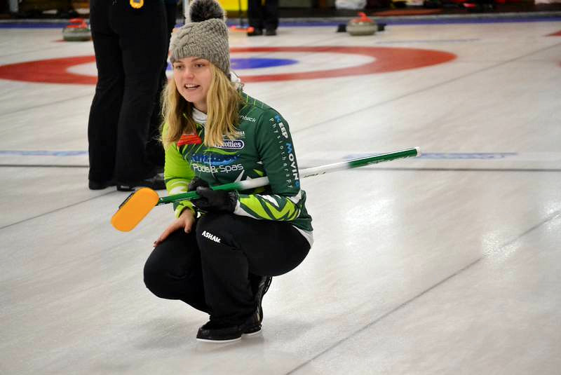 Chloé McCloskey watches her rock during P.E.I. Scotties women’s curling action in Alberton. It’s her first time skipping at the Scotties. She kept her chances alive Friday morning, winning an elimination game 7-5 over Montague’s Tammy Dewar. – Eric McCarthy