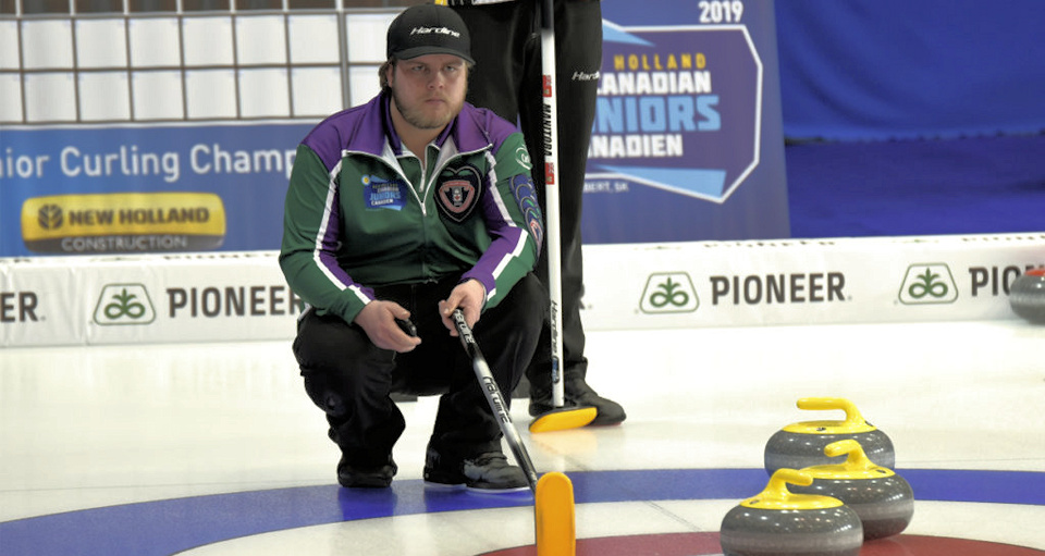 Tyler Smith holding the broom during the 2019 New Holland Canadian Juniors (Curling Canada/Melanie Johnson photo)