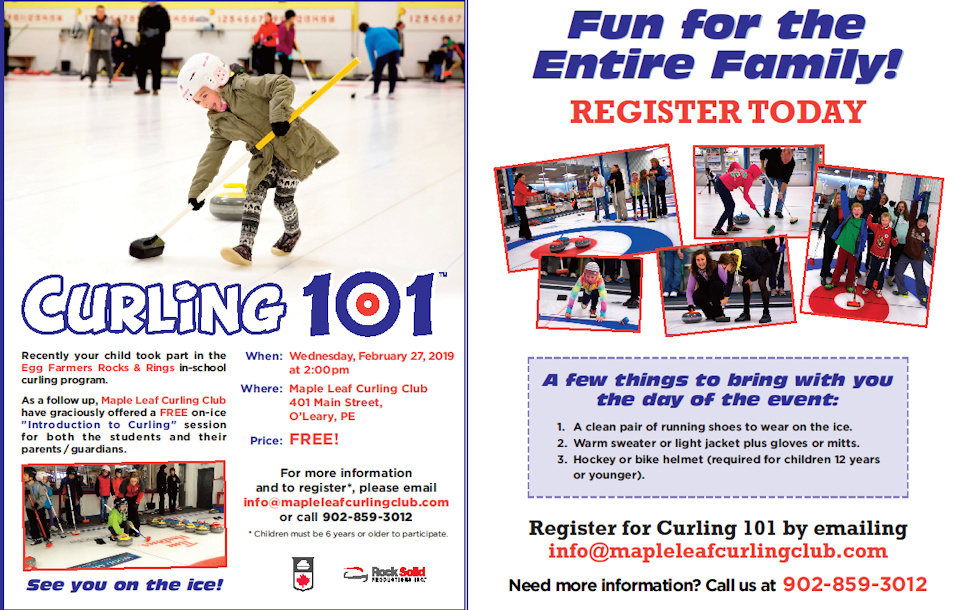 Recently your child may have taken part in the Egg Farmers Rocks & Rings in-school curling program. As a follow-up, the Maple Leaf Curling Club has graciously offered a FREE on-ice “Introduction to Curling” session for both the students and their parents / guardians.