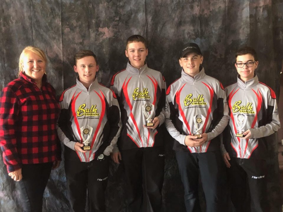 (L-R) Coach Brenda MacMillan, skip Mitchell Schut, third Chase MacMillan, second Cruz Pineau, lead Liam Kelly