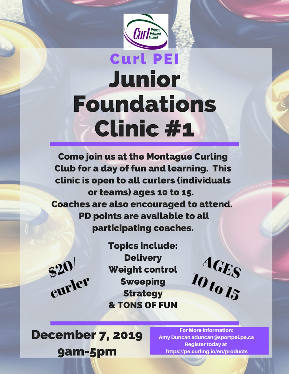 Curl PEI is excited to announce their first Junior Foundations Clinic of the season. It will be December 7, 2019 from 9 am-5 pm at the Montague Curling Club. This Clinic is designed for 10-15 year olds. Curlers can join as a team or as an individual. Coaches and parent helpers are encouraged to join for the day (PD points will be awarded to those coaches who help for the day).