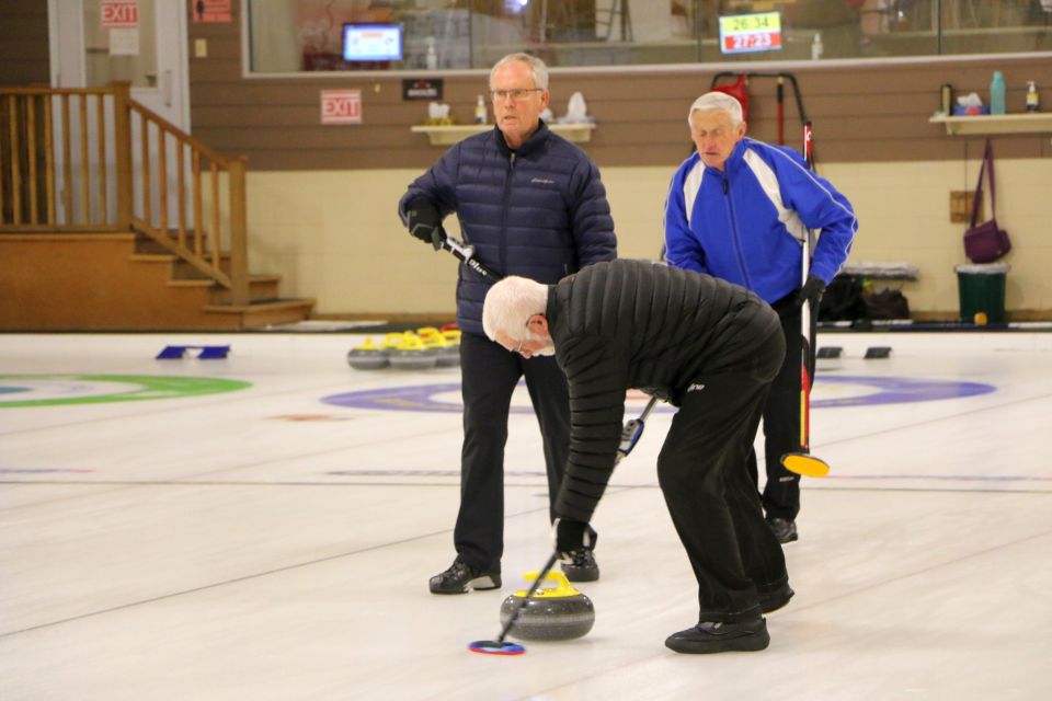 Lou Nowlan (in blue) delivers a rock, while Earle Proude sweeps, and Alan Montgomery keeps an eye on the line in the “A” Qualifier Game Friday afternoon