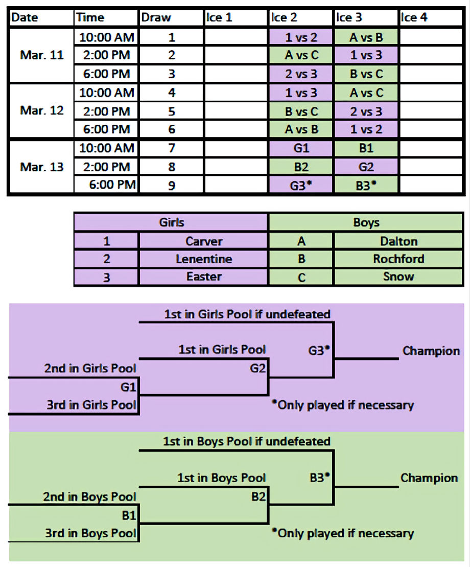 The three girls teams and an equal number of boys rinks signed up will play a double round-robin format, followed by a two or three-game championship round, with the third game needed only if a team went through the double round-robin undefeated and loses their first championship game.