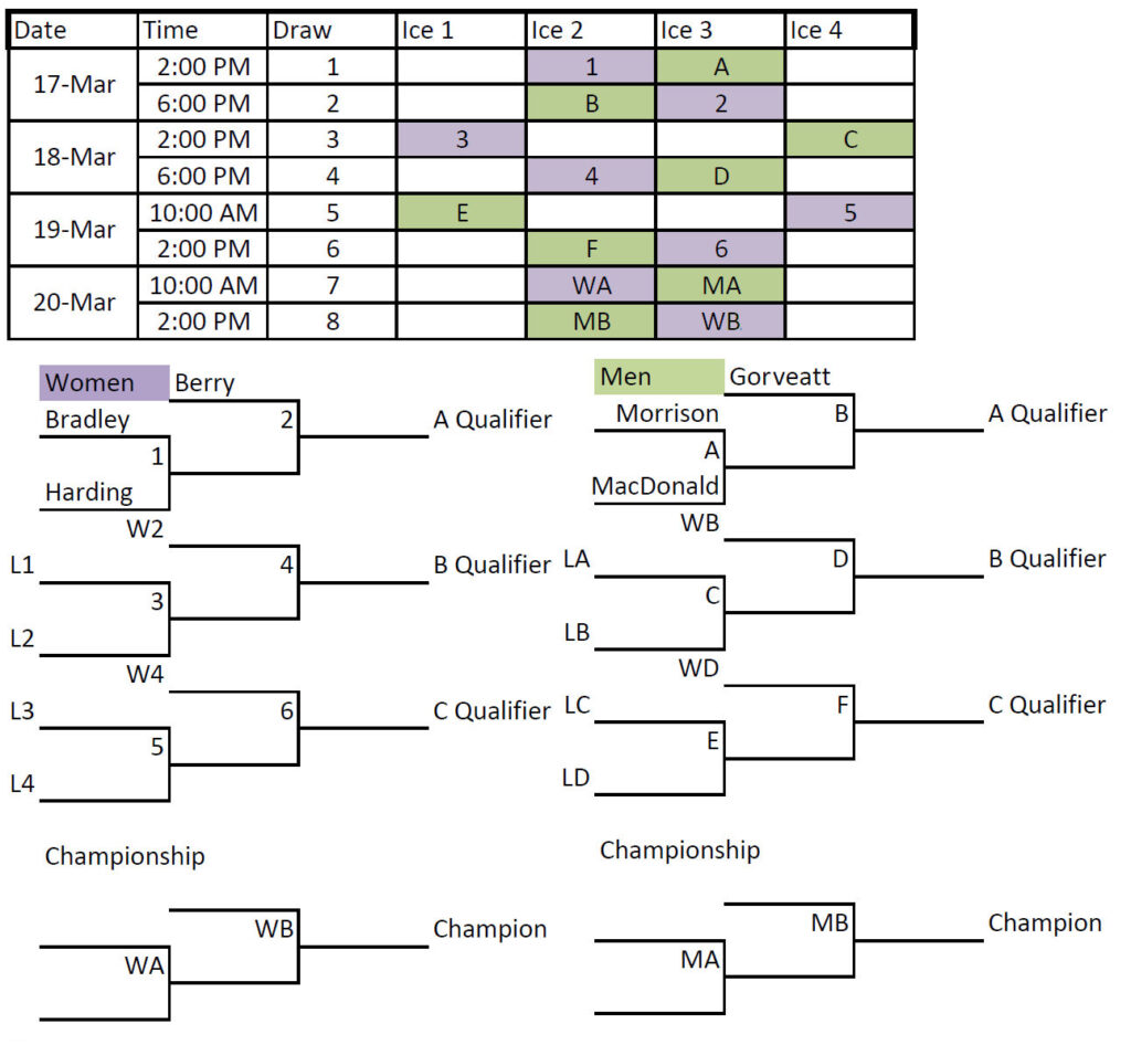 At last year’s event, the Phillip Gorveatt rink went undefeated to repeat as Senior Men’s champs, winning his 4th Senior Men’s title in five years, while the Kim Dolan team also went undefeated to repeat as Senior Women’s champions. Gorveatt is back this year, as is last year’s Senior Women’s Finalist team, skipped by Shirley Berry.