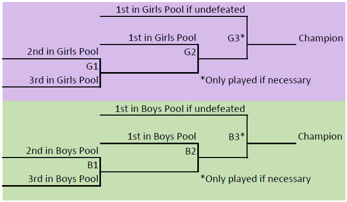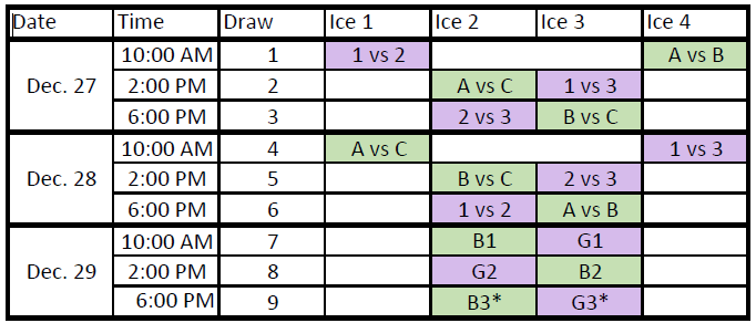The three girls teams and an equal number of boys rinks signed up will play a double round-robin format, followed by a two or three-game championship round, with the third game needed only if a team went through the double round-robin undefeated and loses their first championship game.