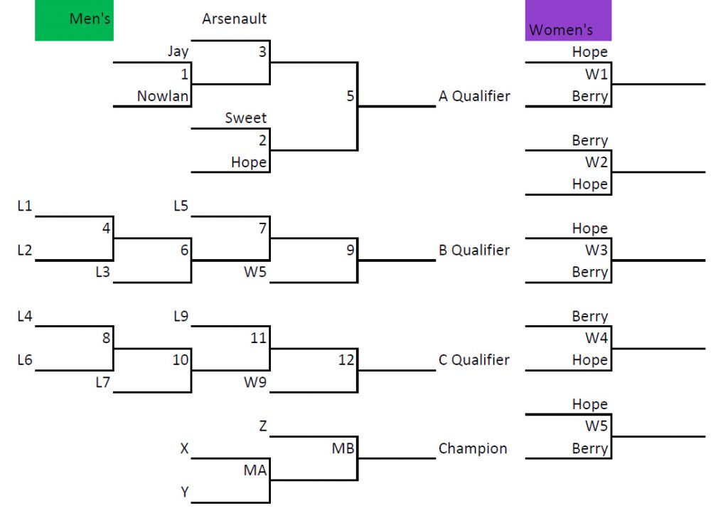 The five-team men’s division will play a modified triple knockout format, qualifying section winners for a two-game championship round. Section winners also drop down to compete in the next section. If a team wins all three sections, they will win the event with no championship round being played. If a team wins two sections, they will win the event if they win either championship round game, while their opponent would have to win both.